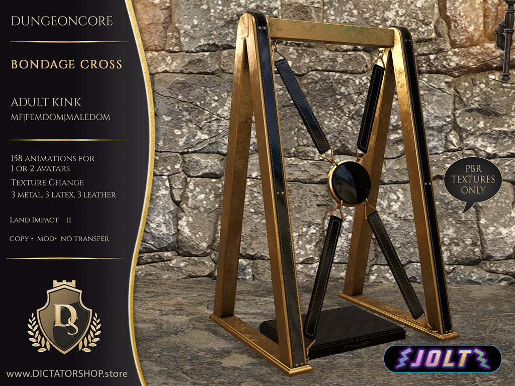 Adult Kink · Jolt Enabled The DungeonCore Bondage Cross is built for serious play. Solid, reliable, and unapologetically functional, this Adult Kink, Jolt-enabled cross comes with over 158 fully exclusive Bento animations, all purpose-made specifically for this frame. This is…