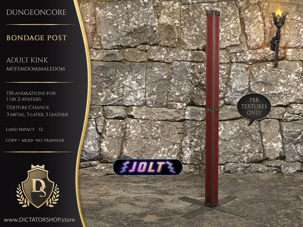 Adult Kink · Jolt Enabled The DungeonCore Bondage Post is a compact, brutal essential designed for focused control and reactive play. This Adult Kink, Jolt-enabled post includes 138 fully exclusive Bento animations, all purpose-built specifically for this piece. Small footprint.Serious…