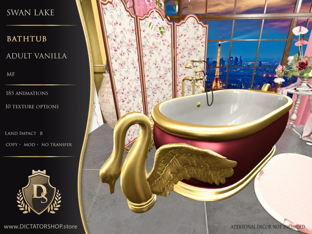 The Swan Lake Bathtub comes in two versions: [Ds] Swan Lake Bathtub Adult Vanilla with 185 animations [Ds] Swan Lake Bathtub PG with 108 animations The Swan Lake Bathtub is designed to add a touch of luxurious extravagance to your…
