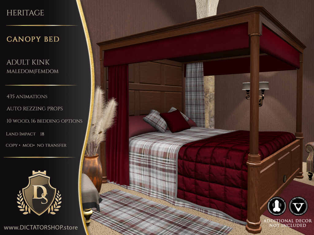 The Canopy Bed comes in three versions: [Ds] Heritage – Canopy Bed Adult Kink with 435 animations [Ds] Heritage – Canopy Bed Adult Vanilla with 313 animations [Ds] Heritage – Canopy Bed PG with 134 animations This all-new bed…